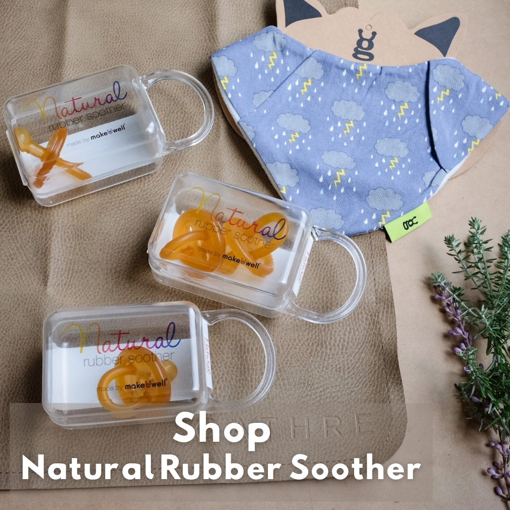 Natural Rubber Soother dummies are made from natural rubber, without added PVC, Phthalate, or parabens. The dummies have large shields designed to touch babies' nose, mimicking breastfeeding. Natural Rubber Soother dummies have one-piece construction without joints, therefore easy to clean.