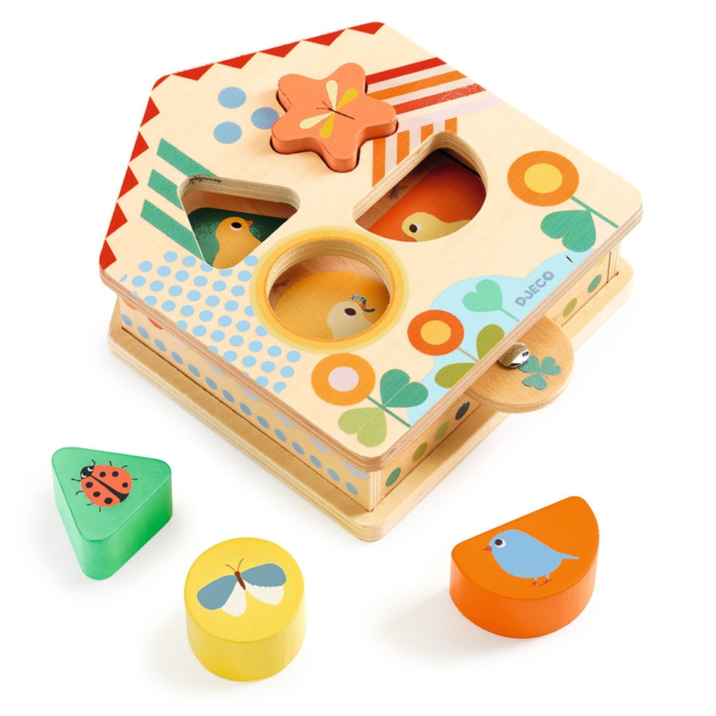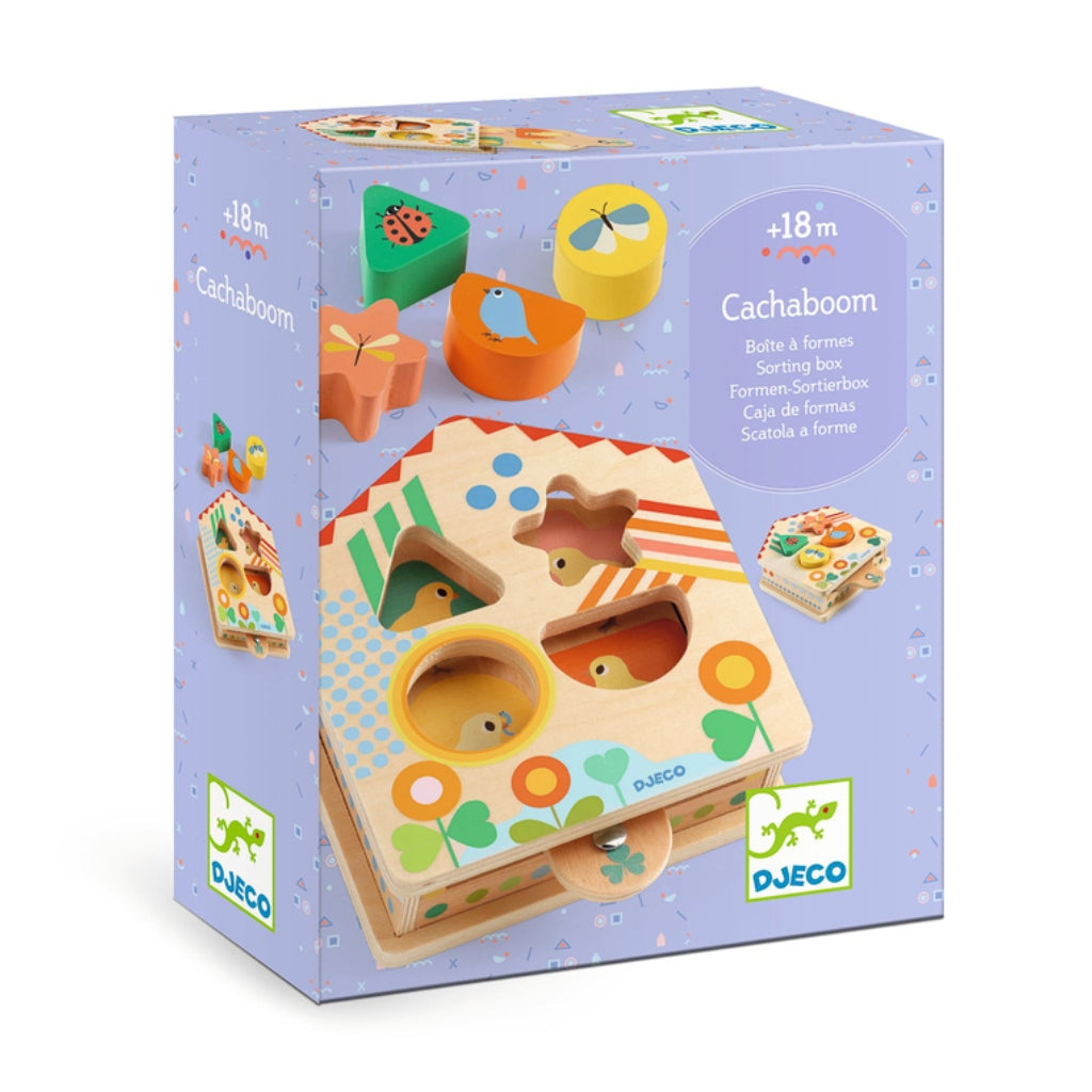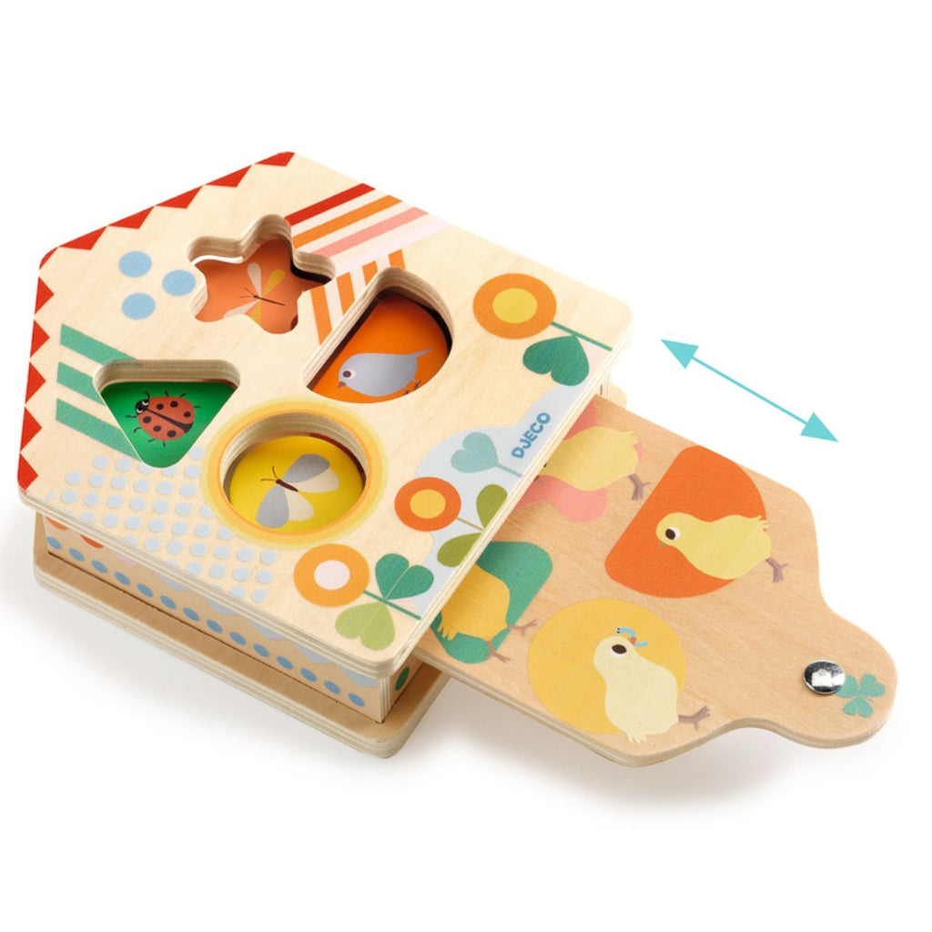 Djeco Cacaboom Shape Sorter with Tab is a house-shaped wooden sorting box for ages 18 months and up. The child slides the 4 geometric pieces into the corresponding holes. They pull on the tab, and what a surprise to see the pieces disappear all at once. When you push the tab, the pieces reappear outside the box for your child to start over.