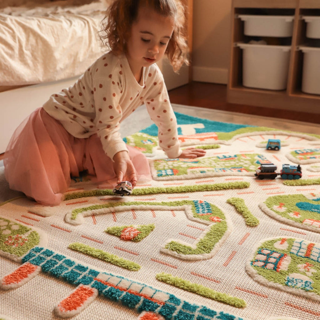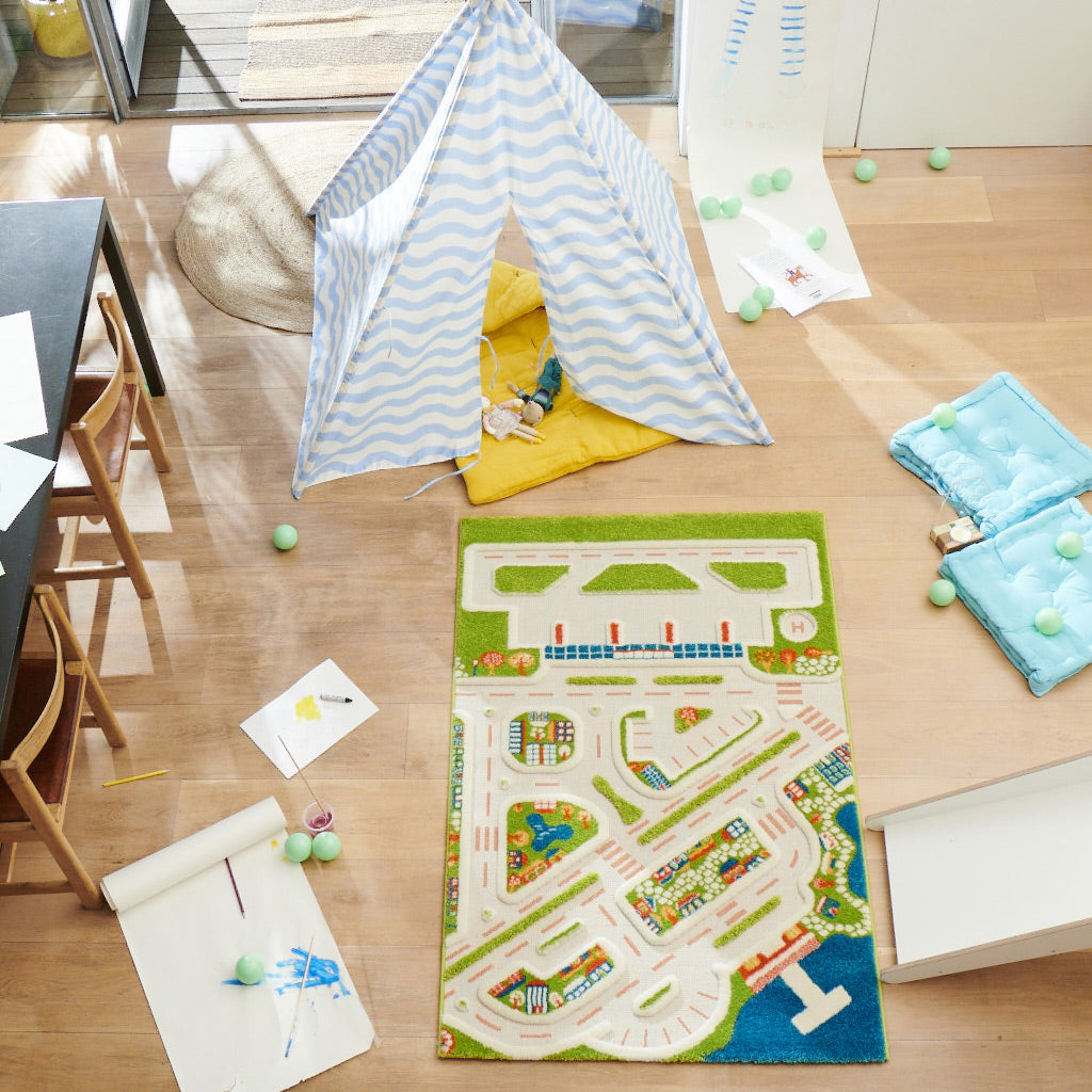Made from high-quality materials, ivi Play Rug unique 3D features with different surface thickness & textures are inviting for children to bring their toys and play.
