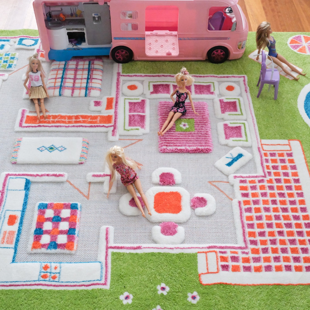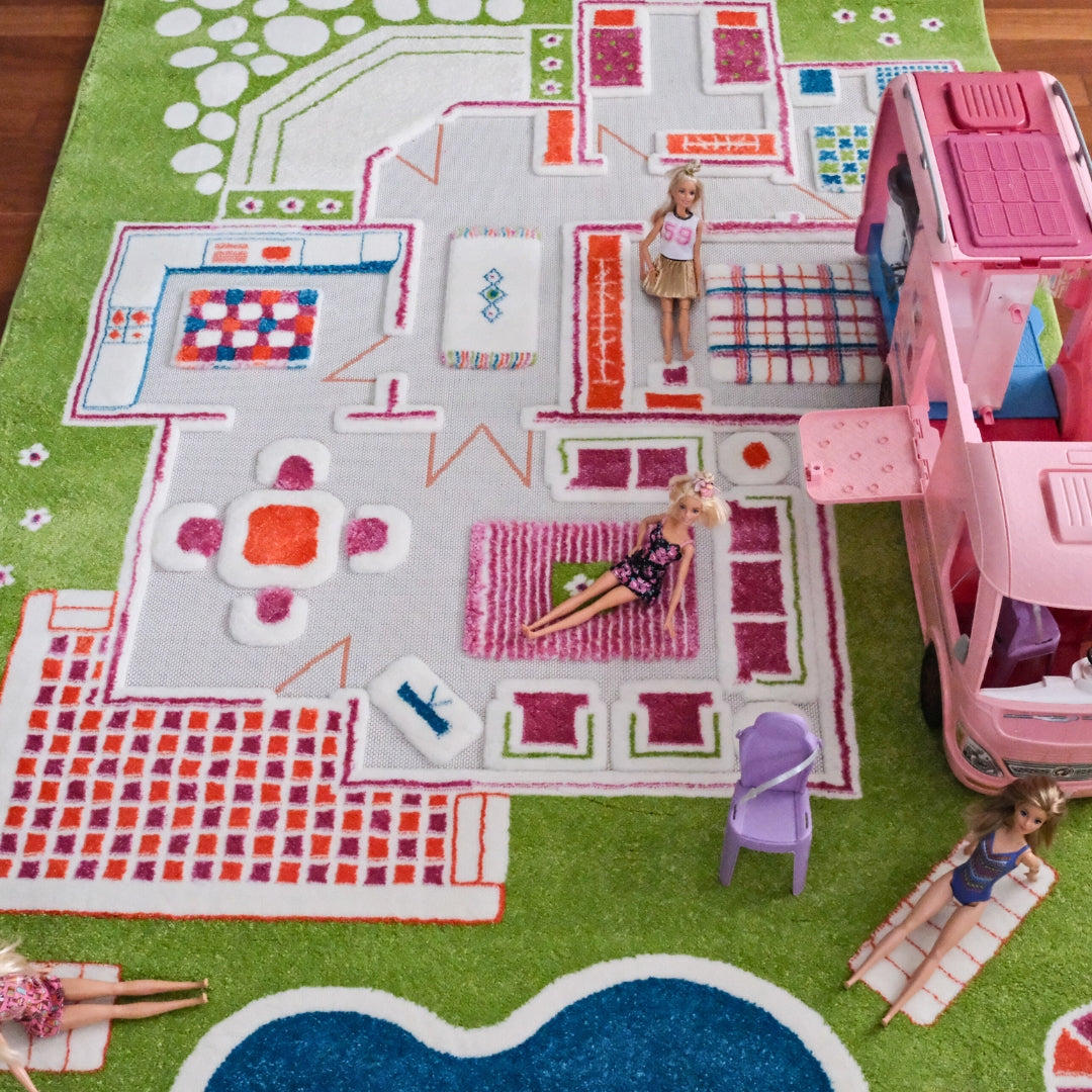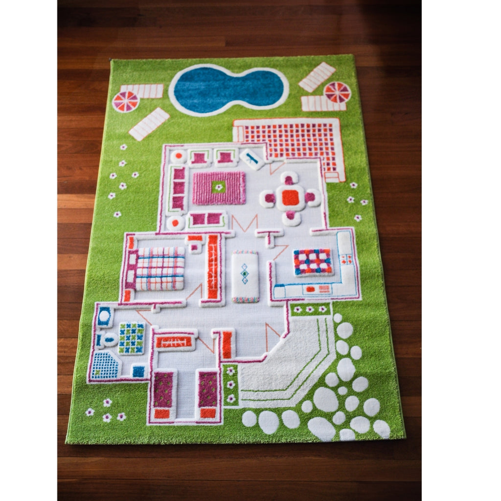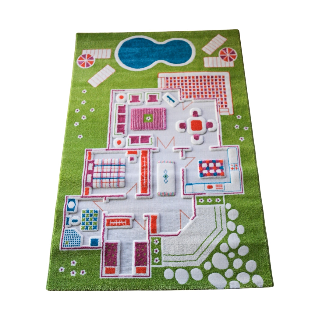 IVI Playhouse Green 3 dimensional play rug will keep the kids busy for hours as they bring imaginary worlds to life. Featuring a detailed dollhouse (sans walls), pool and lush green lawn