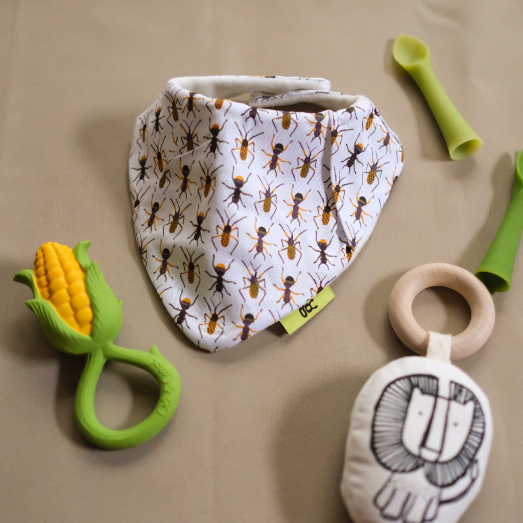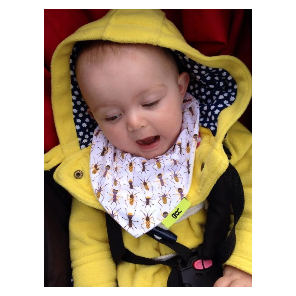 Love from Bug bibs are made from light cotton outer and lined with extra soft non-pill fleece lining. They are thick and super absorbent, and help keeps chest and clothes dry, prevent rashes and chest infection. No more changing clothes multiple times, just the bib (hurray to less washing!)