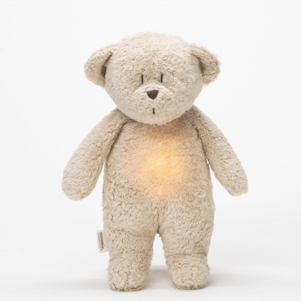 Moonie Organic Humming Bear 2.0 - Sand is a sleep aid, playing soothing & comforting noises to assist babies falling asleep. It also has delicate LED lights, great for older children who get worried about complete darkness. Moonie 2.0 has improved module with light on/off shake function, Debussy soothing tune and ability to voice record.