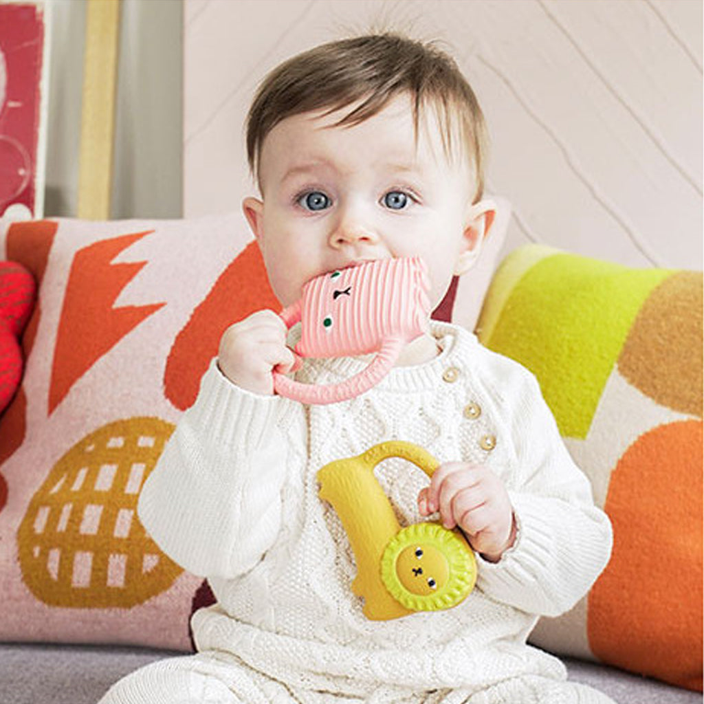 Roar! Meet Richie the Lion. Richie is a collaboration between Donna Wilson and Oli & Carol, and he is inspired by children's drawings. Richie is a chewable baby teether, baby bath toy and because of his texture, he is also a sensory toy which will delight babies.