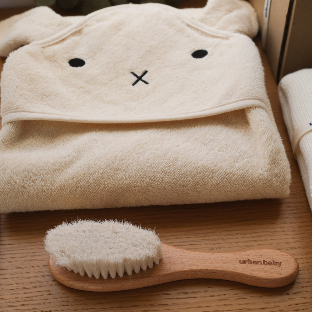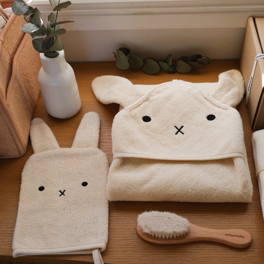 - Organic Cotton Hooded Bunny Baby Towel & Bath Mitt Set in Creme