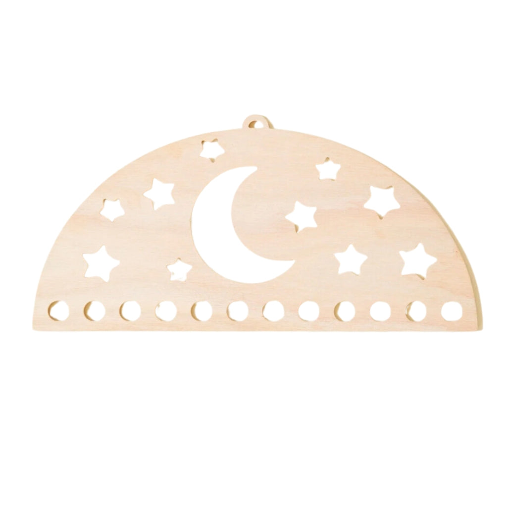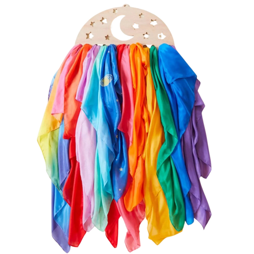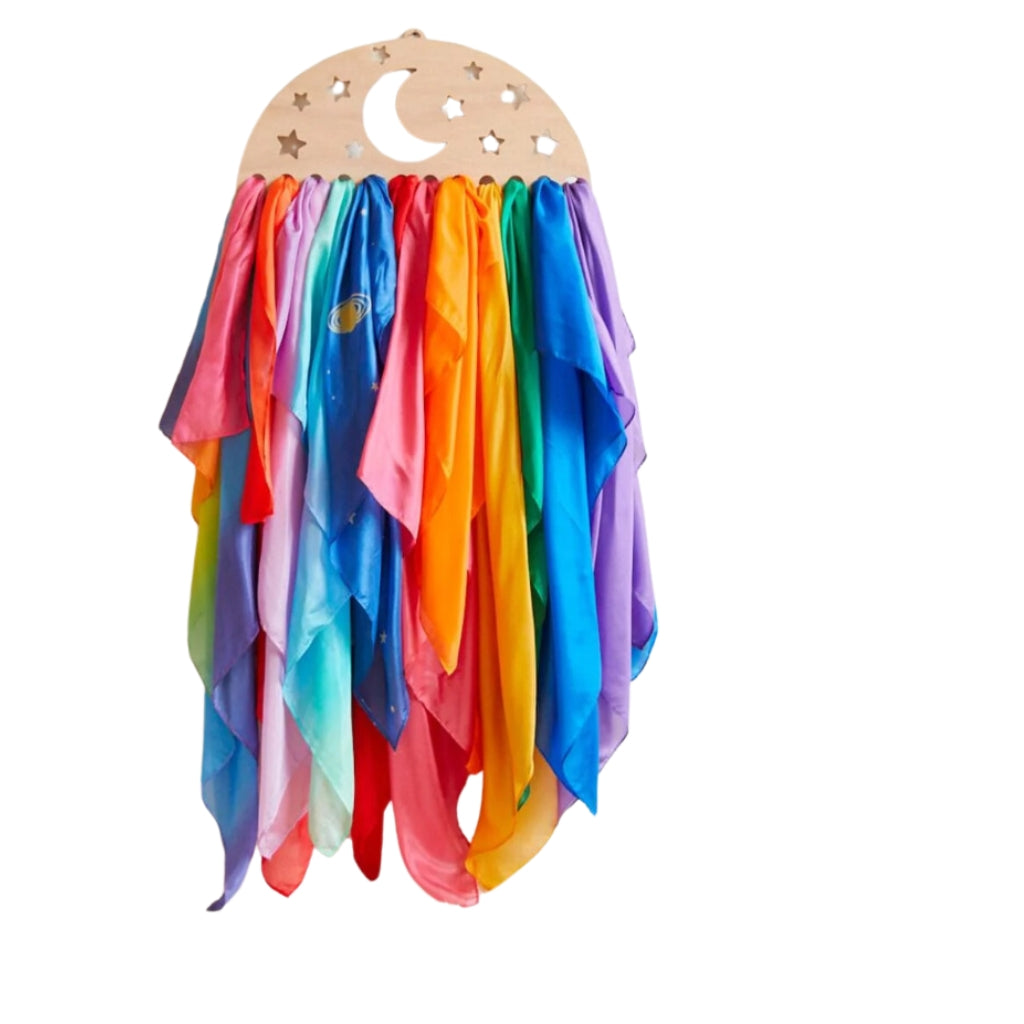 Enhance your playroom decor with this Wooden Rainbow Display! Perfect for organizing your kiddo's playsilks, cloths, and Waldorf toys, this wooden essential will help to encourage young ones to stay tidy and keep their playroom in perfect order. Hang it on the wall and watch your little one's eye sparkle with delight!