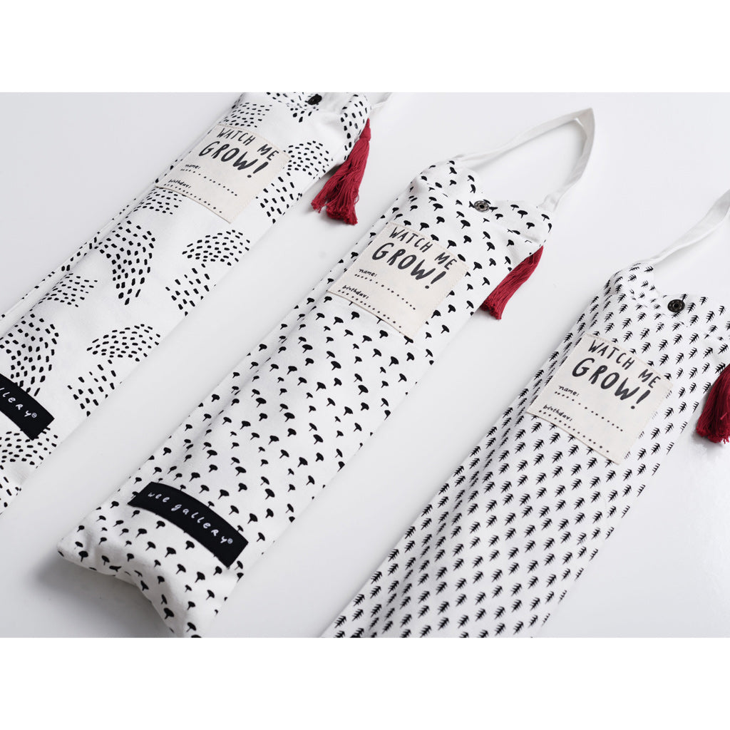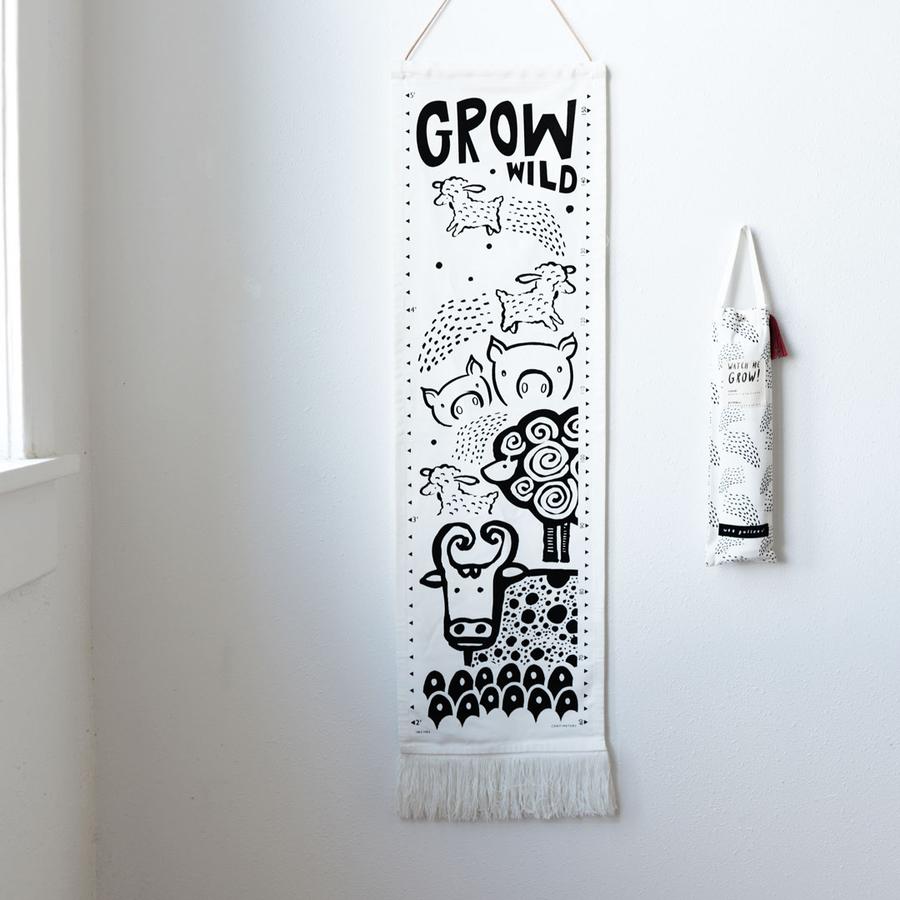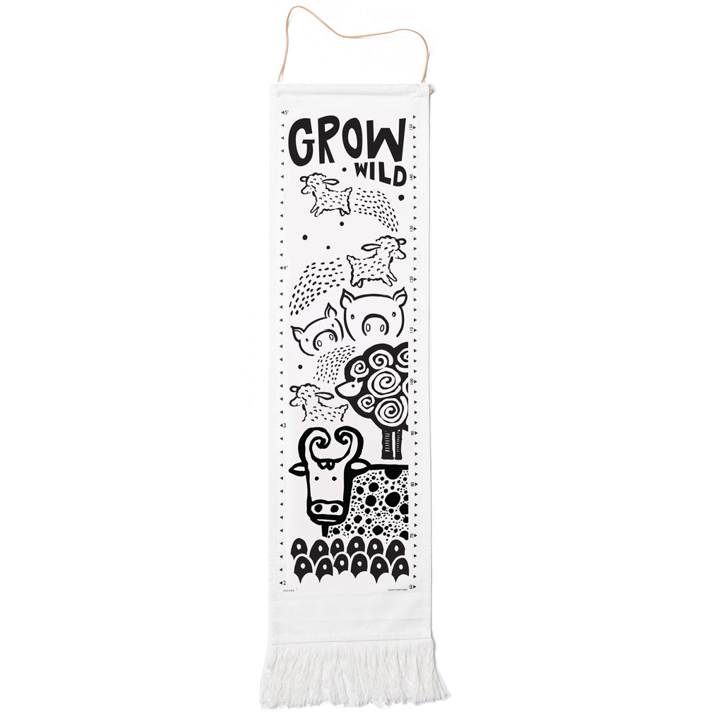 The Wee Gallery growth chart features distinctive high contrast black-and-white images Wee Gallery style. The growth chart is ethically and sustainably made in India using screen printing on organic cotton canvas, finished with a hanging cord and stylish fringe end. It also comes in a special keepsake bag with a place for your child's name and birth date.