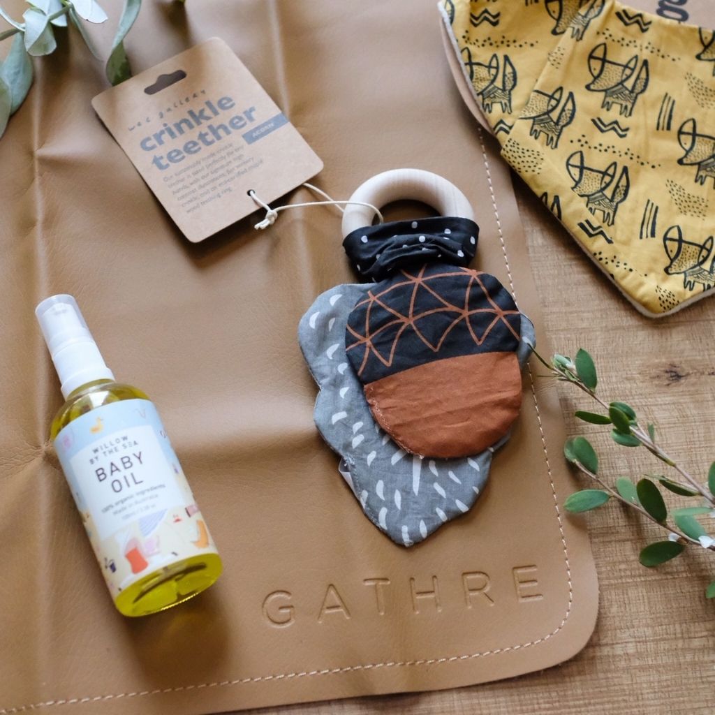 With Wee Gallery's signature high contrast design, on 2 crinkly toys and paired with a maple teething ring, the crinkle teether will delight little ones' senses.