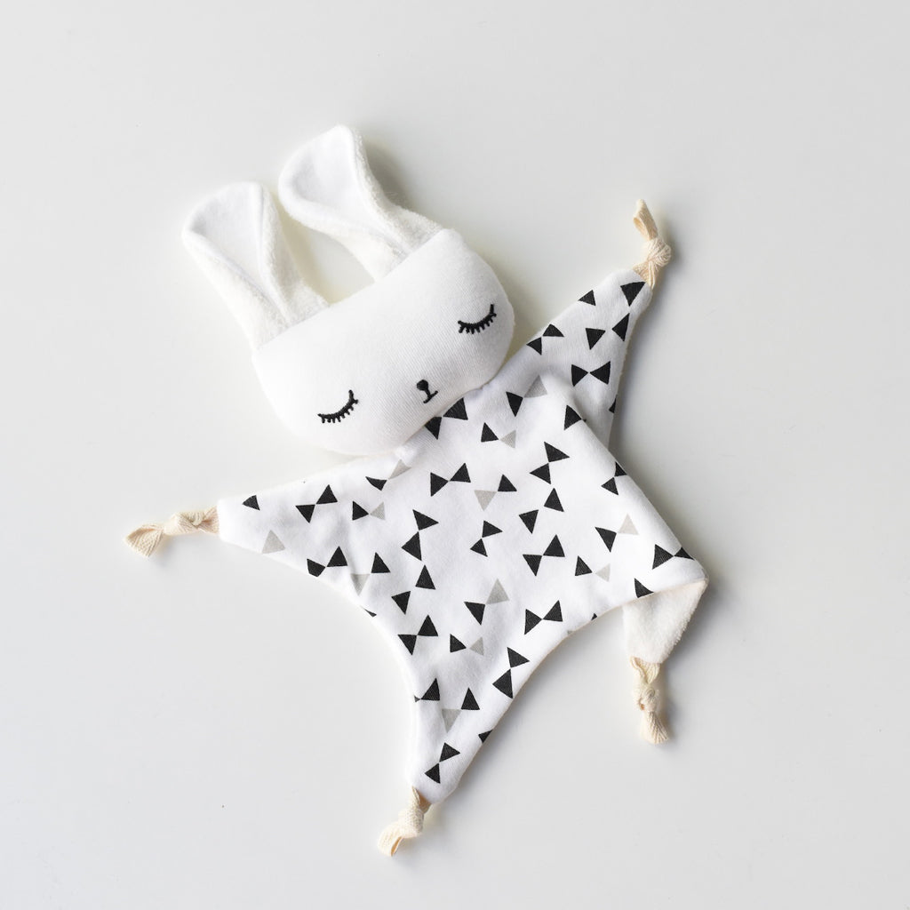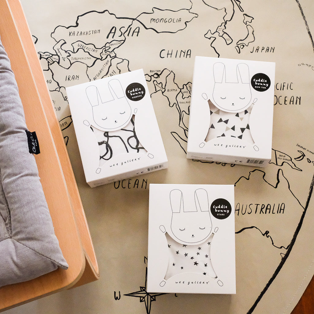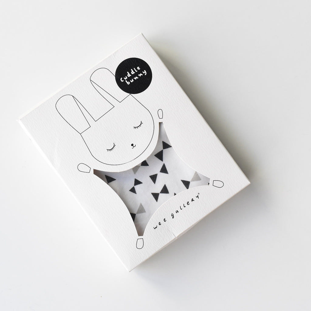 This sweet cuddle bunny is made with little hands and eyes in mind. The signature Wee Gallery high-contrast graphics grab baby's attention visually, while its taggy hands and feet make it easy for your little one to love from day one. This beautiful bunny is made from GOTS certified organic cotton in factory with fair trade practices.