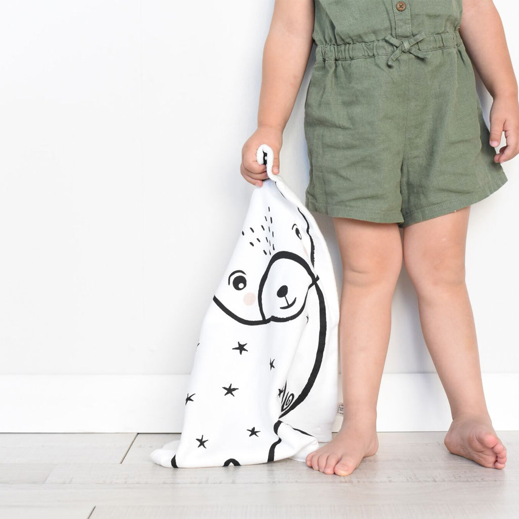 This sweet snuggle blanket from Wee Gallery is made with little hands and eyes in mind. The signature Wee Gallery high-contrast graphics capture baby's attention visually, while its taggy ears make it easy for your little one to hold on to from day one.