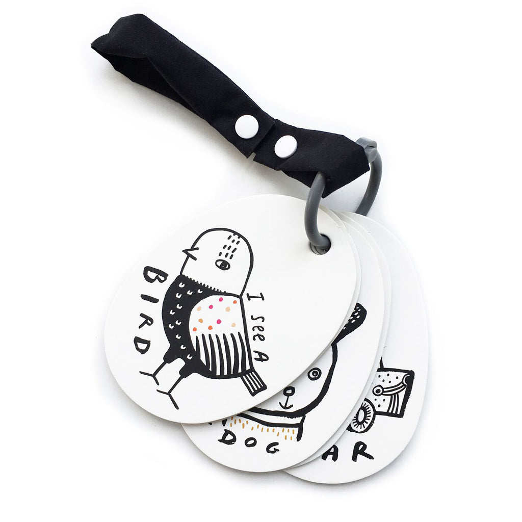 Contains 5 beautifully illustrated cards that are super sturdy. Held together with a ring an strap, they are easy to attach to strollers or bag. Easy to take on a trip but not easy to lose.